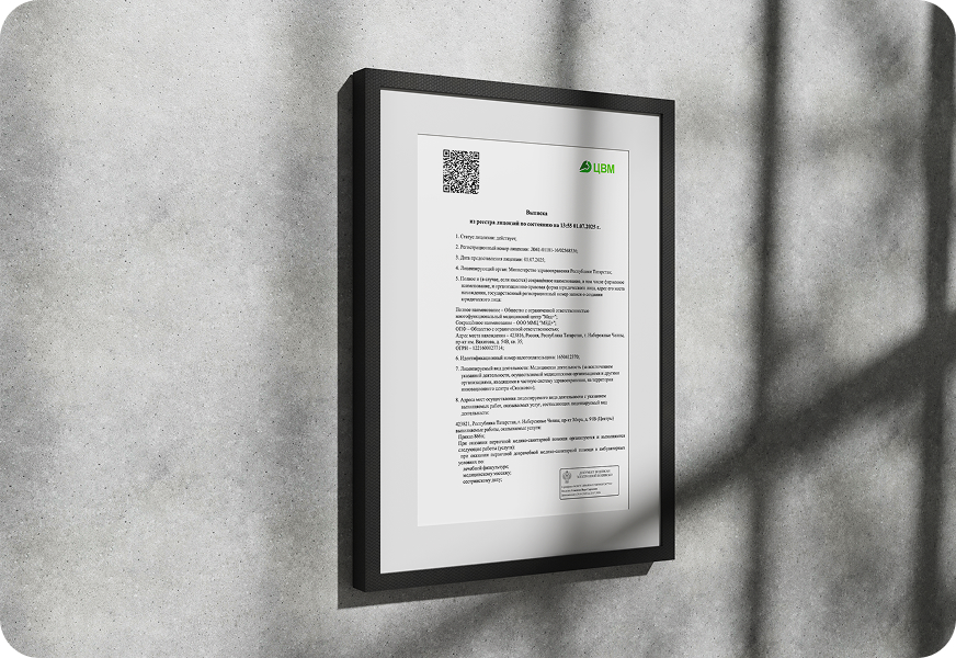Лицензия №: Л041–01181–16/02568536 от 01.07.2025 г. на осуществление медицинской деятельности ООО ММЦ «МЕД+»